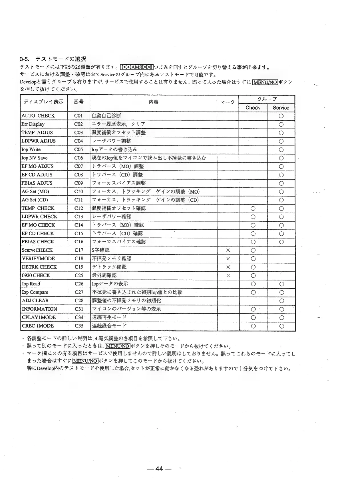 Sony MDS-E12 - 3-5. Selecting the Test Mode; For details of each adjustment mode, refer to 4. Electrical Adjustments on page 56.; Modes with (x) in the Mark column are not used for servicing and therefore are not described in detail.