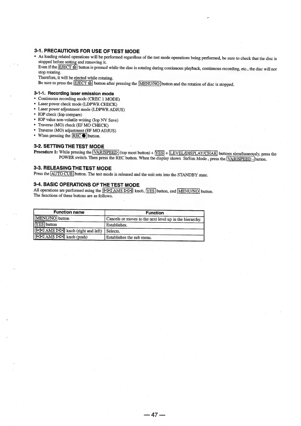 Sony MDS-E12 - 3-1. Precautions for Use of Test Mode; 3-1-1. Recording Laser Emission Mode; 3-2. Setting the Test Mode; 3-3. Releasing the Test Mode