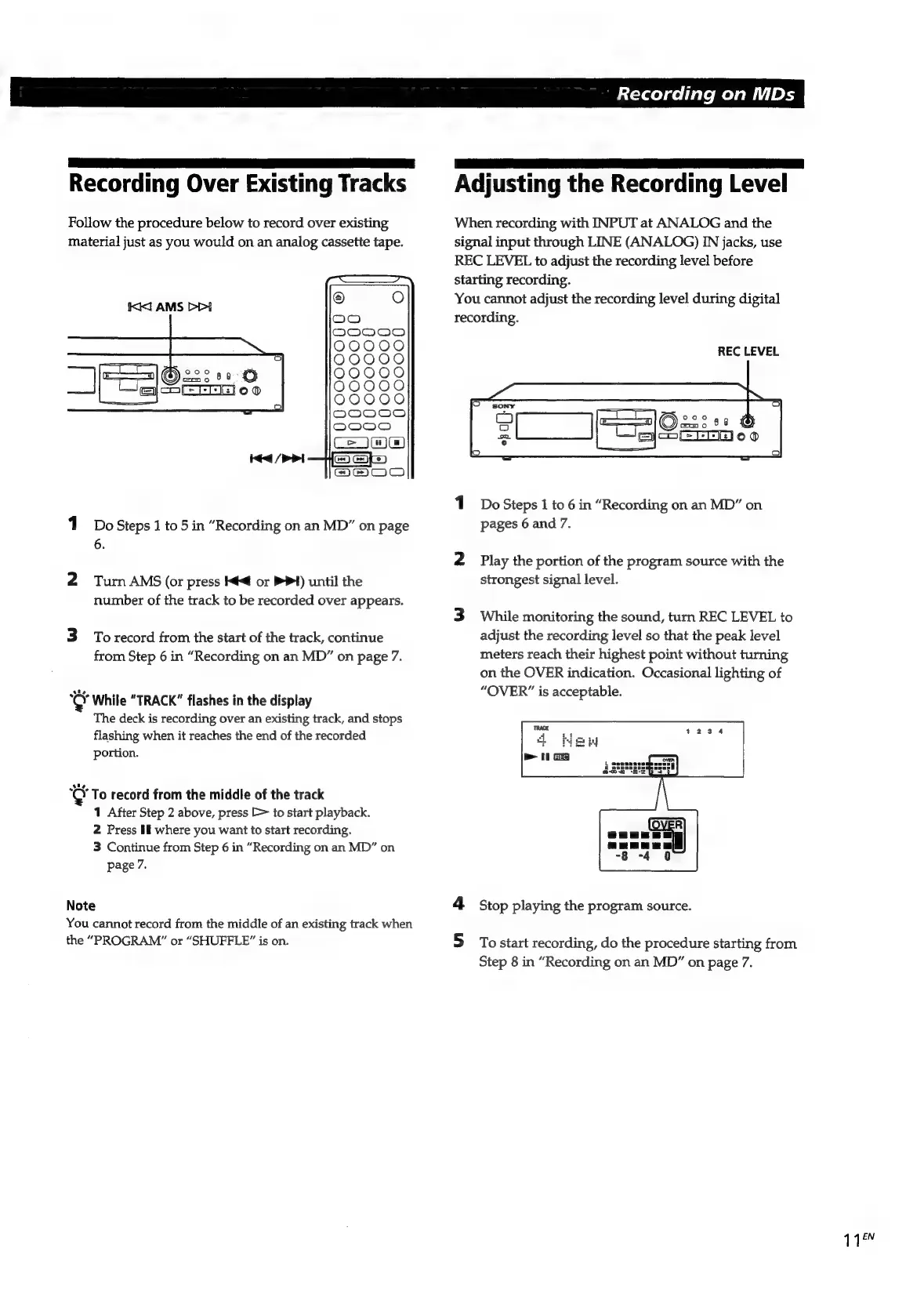 Sony MDS-E55 - Recording over Existing Tracks; Adjusting the Recording Level