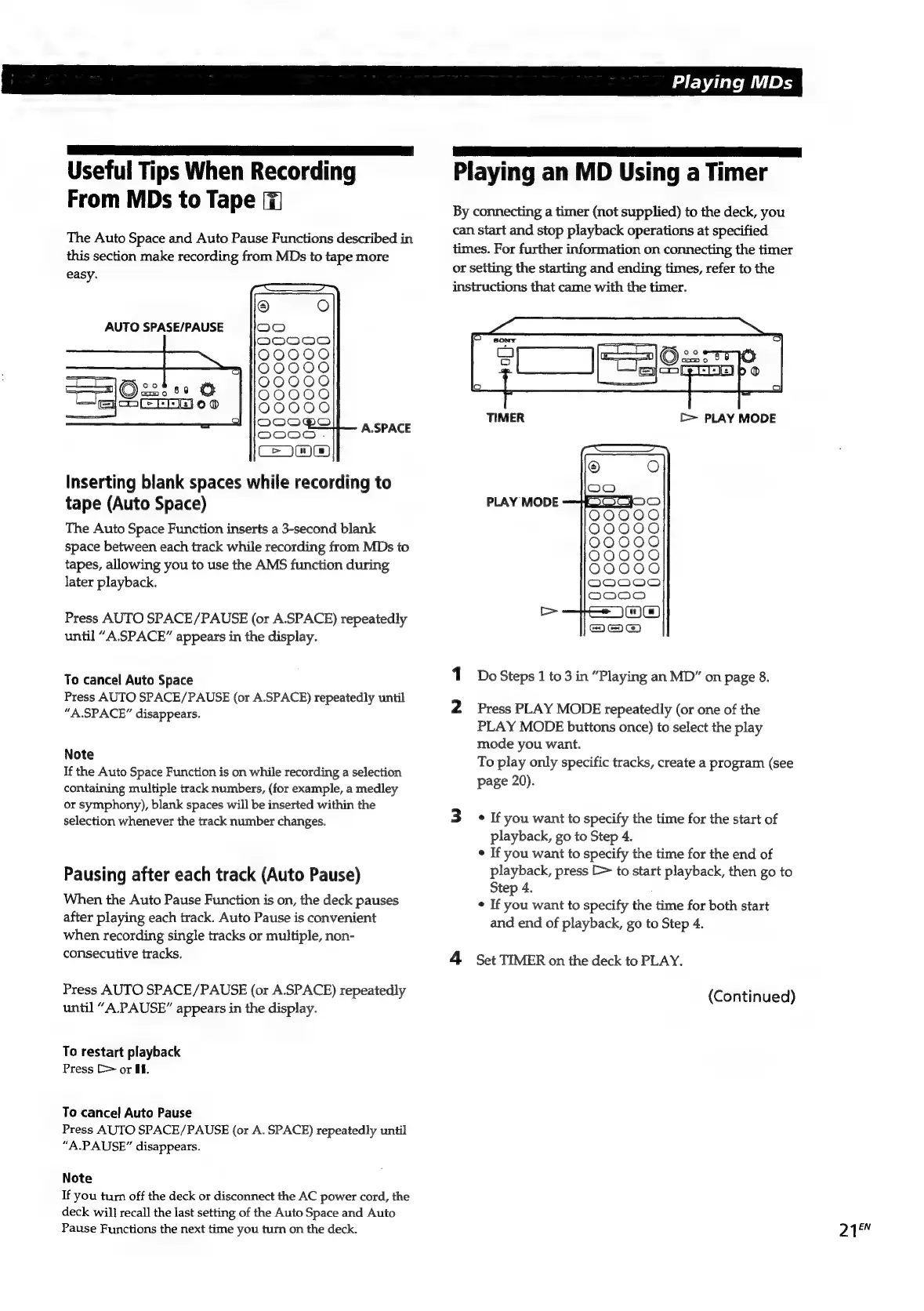 Sony MDS-E55 - Useful Tips When Recording from Mds to Tape; Playing an MD Using a Timer
