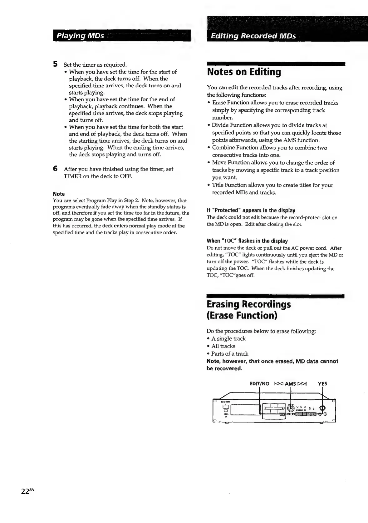 Sony MDS-E55 - Editing Recorded Mds; Notes:on Editing; Erasing Recordings (Erase Function)