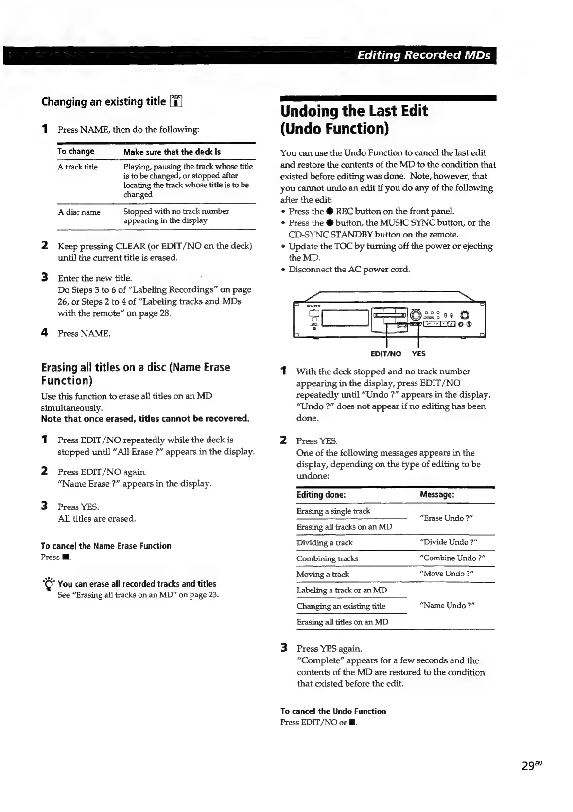 Sony MDS-E55 - Undoing the Last Edit (Undo Function)