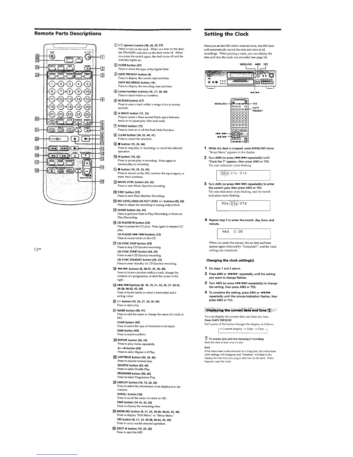 Sony MDS-JB930 - Remote Control Parts Description; Clock Setting and Display; Changing Clock Settings; Displaying Current Date and Time