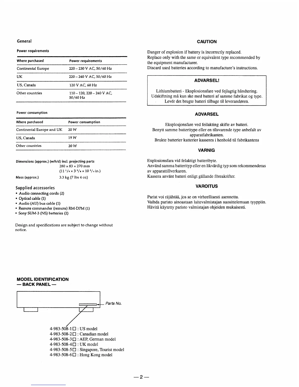 Sony MDS-S37 - General Information; Power Requirements; Power Consumption; Model Identification