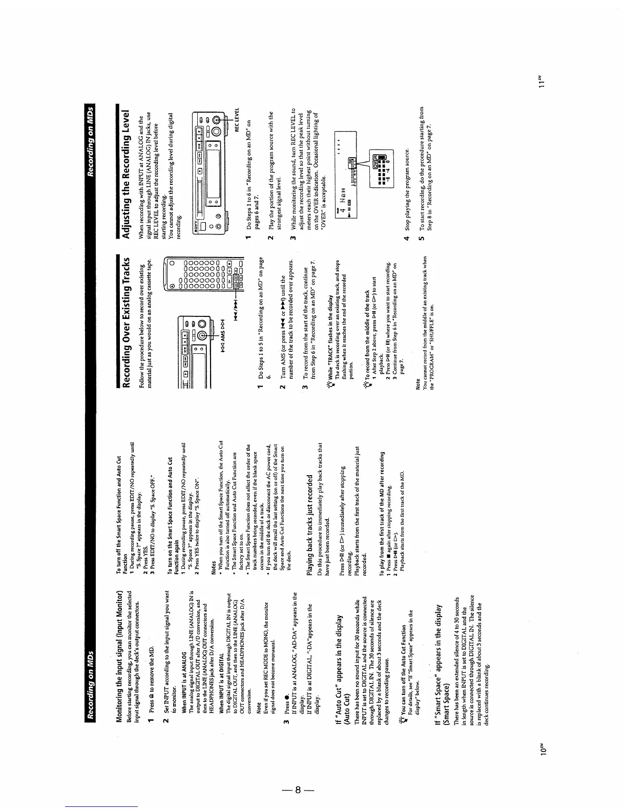 Sony MDS-S37 - Advanced MD Recording Features; Input Signal Monitoring; Recording Over Existing Tracks; Adjusting Recording Level
