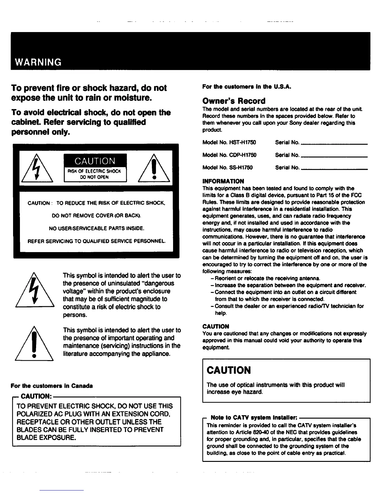 Sony MHC-1750 - Safety Warnings; Owners Record; General Cautions