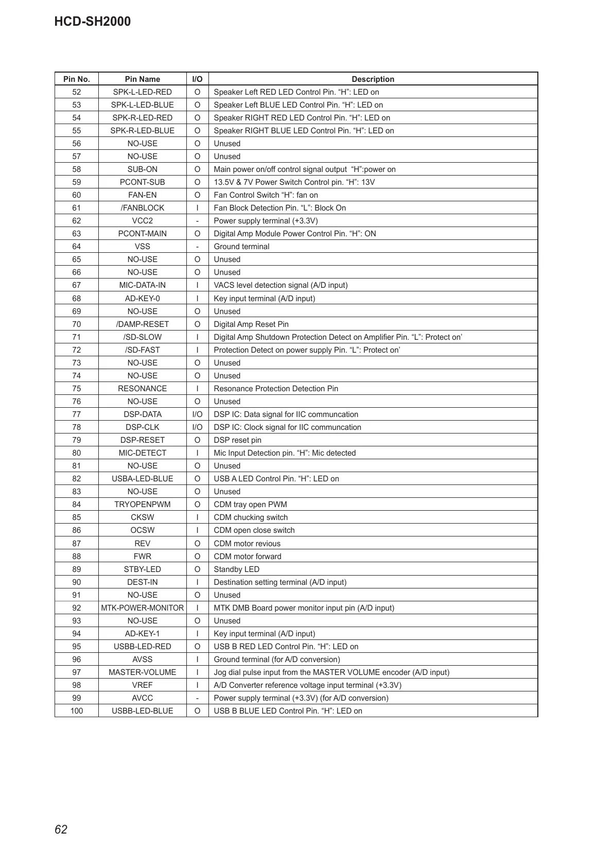 52 SPK-L-LED-RED O Speaker Left RED LED Control Pin. “H”: LED on