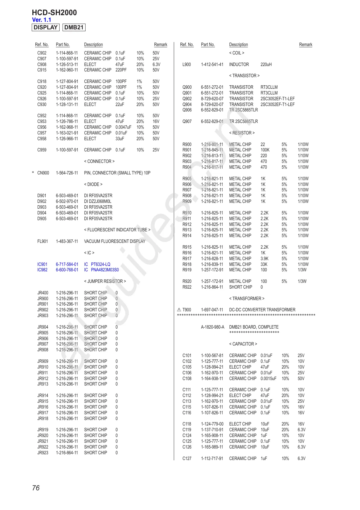 Ref. No. Part No. Description Remark Ref. No. Part No. Description Remark