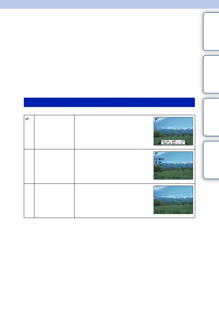 1 During shooting, [Menu] t [Camera] t [Display Contents].