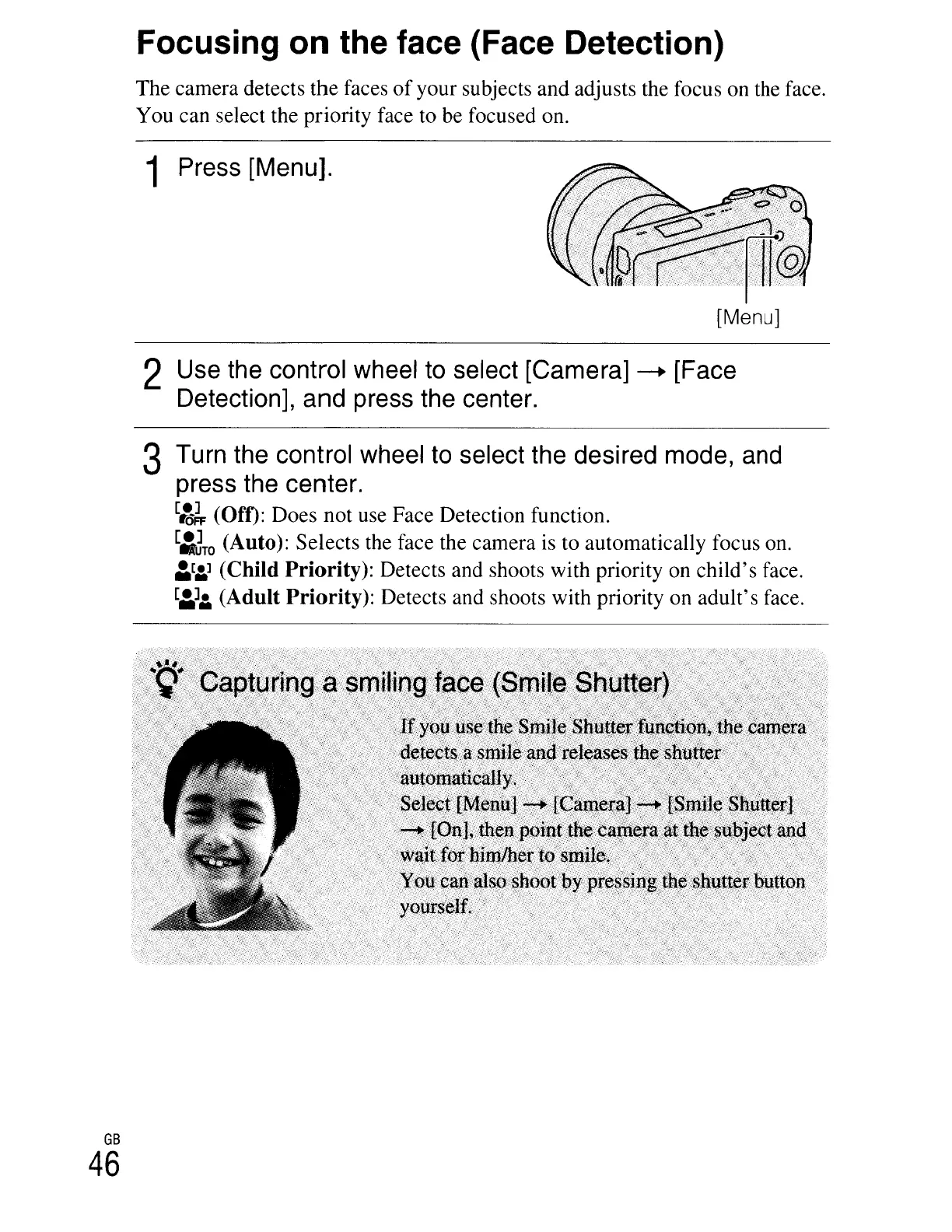 (Child Priority): Detects and shoots with priority on child's face.