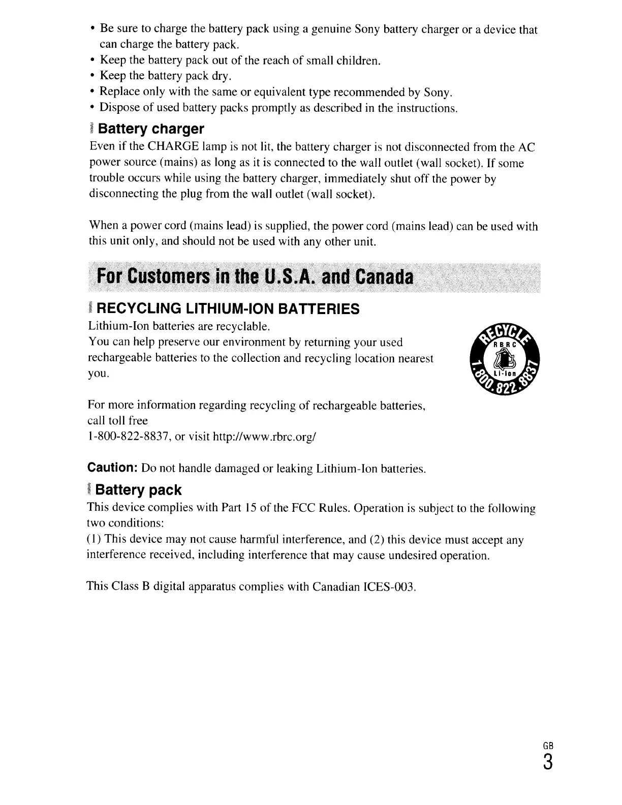 • Be sure to charge the battery pack using a genuine Sony battery charger or a device that