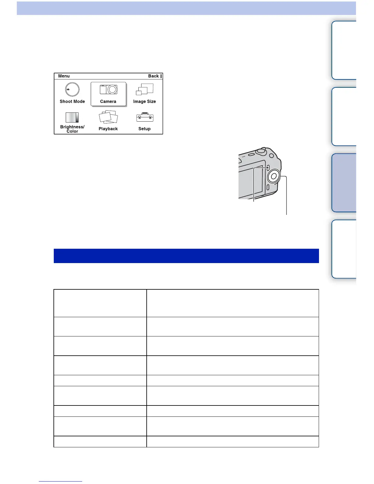 You can set up the basic settings for the camera as a whole, or execute functions such as