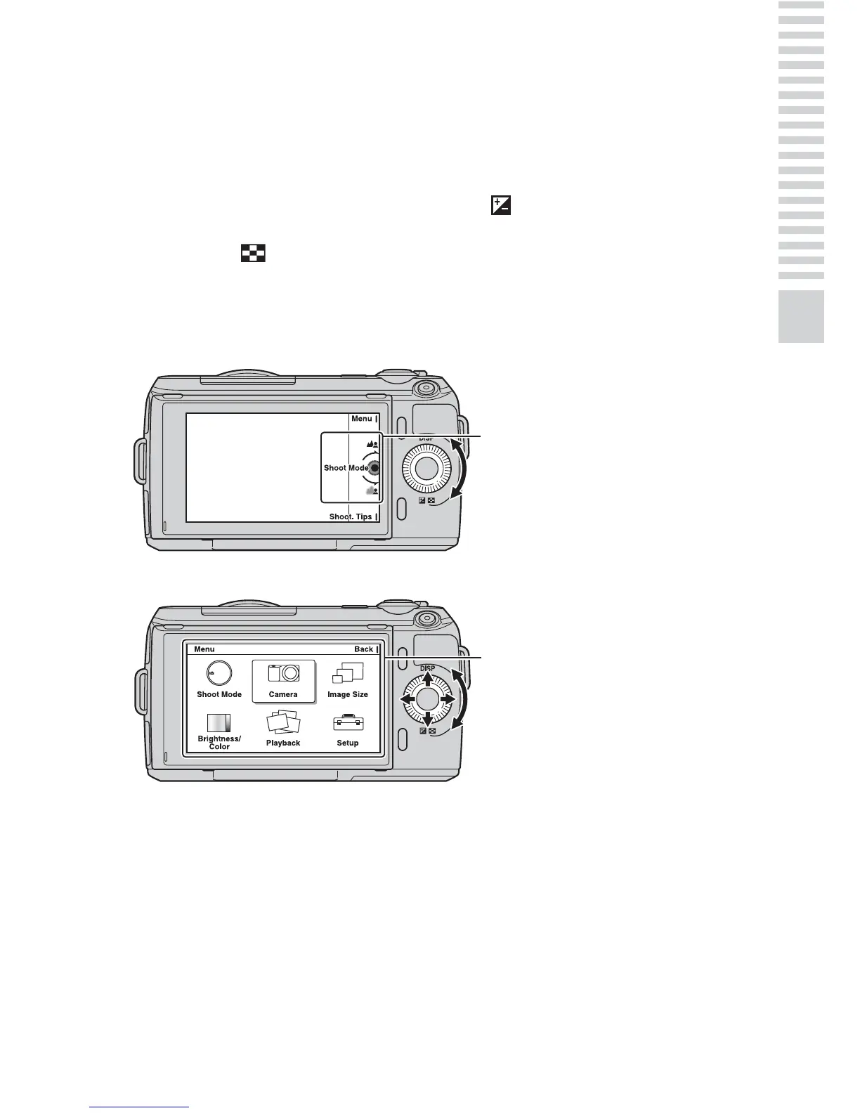 When shooting, DISP (Display Contents) and (Exposure Comp.) functions