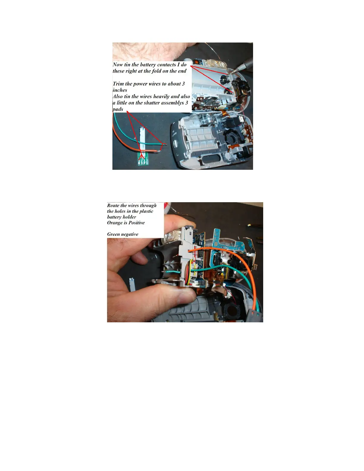 First heat the solder iron and tin both the wires and the battery contacts in the camera as shown