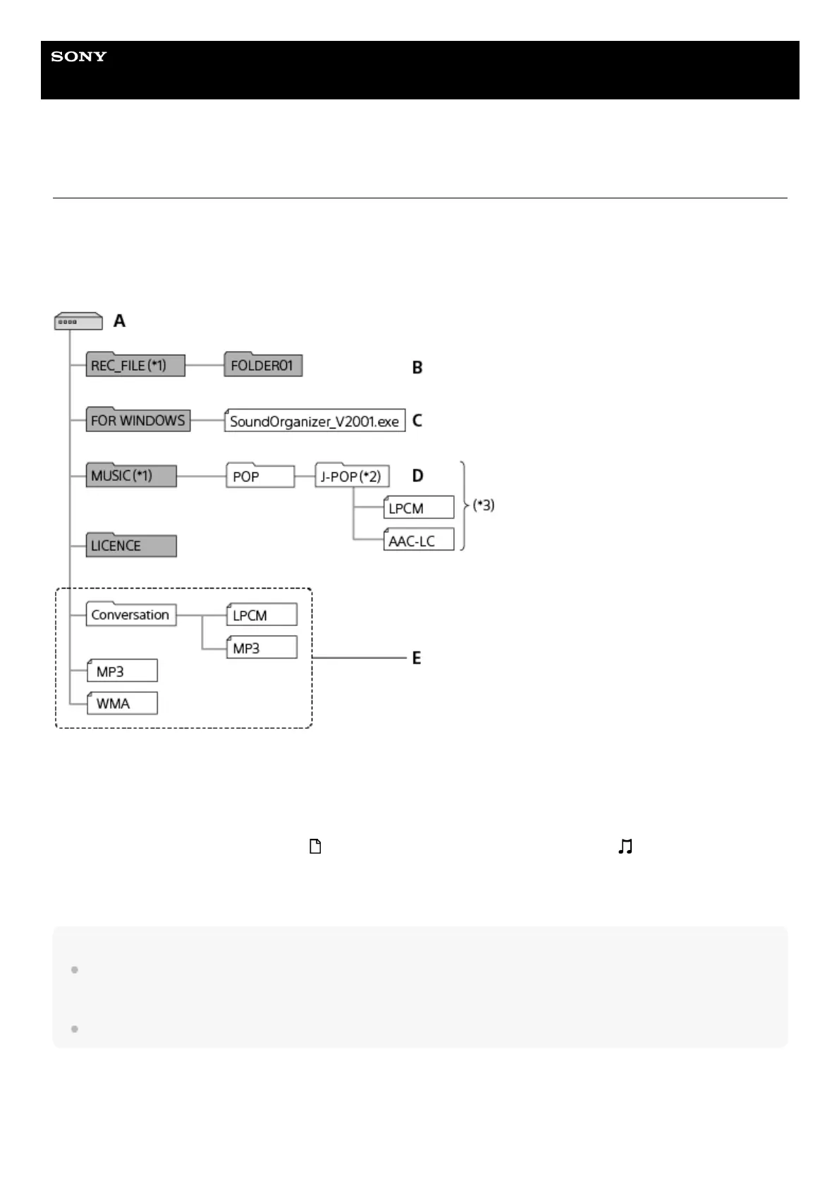 E: Your linear PCM recorder is not capable of detecting any folders and files stored at these folder structure levels.