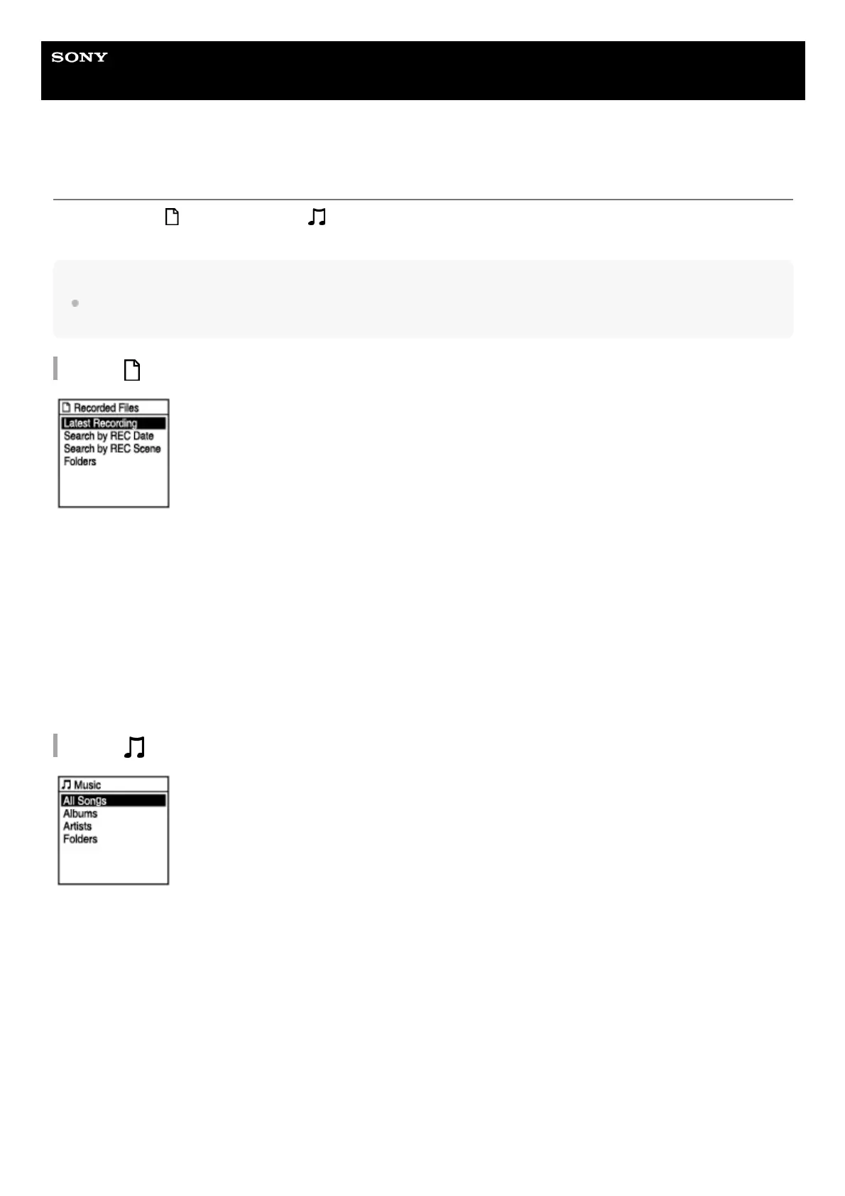 Recorded Files] or [ Music] on the HOME menu, the search categories of the stored files