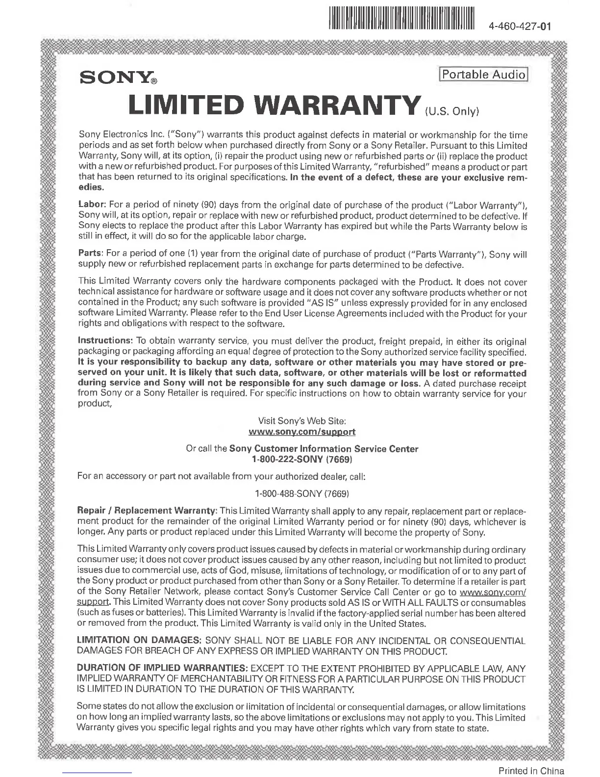 ("Parts Warranty"), Sony will