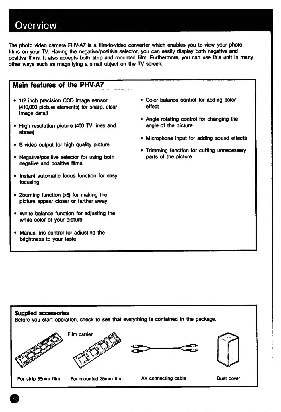 Sony PHV-A7 - Product Overview; Key Features of PHV-A7; Included Accessories