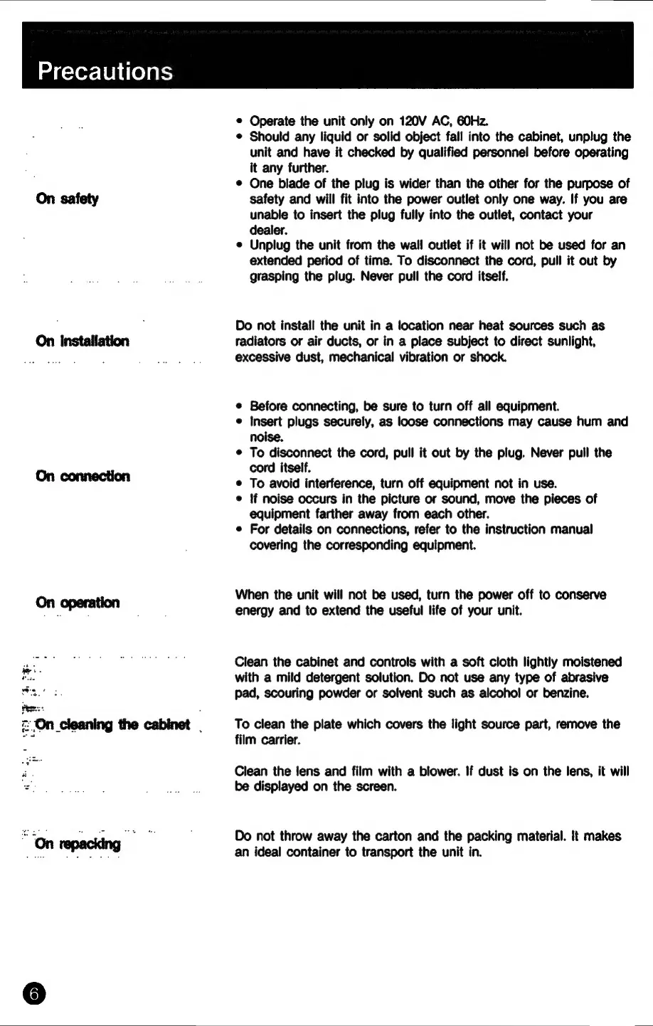 Sony PHV-A7 - Precautions for Use; General Safety Guidelines; Installation and Environmental Placement; Connection and Operation Tips