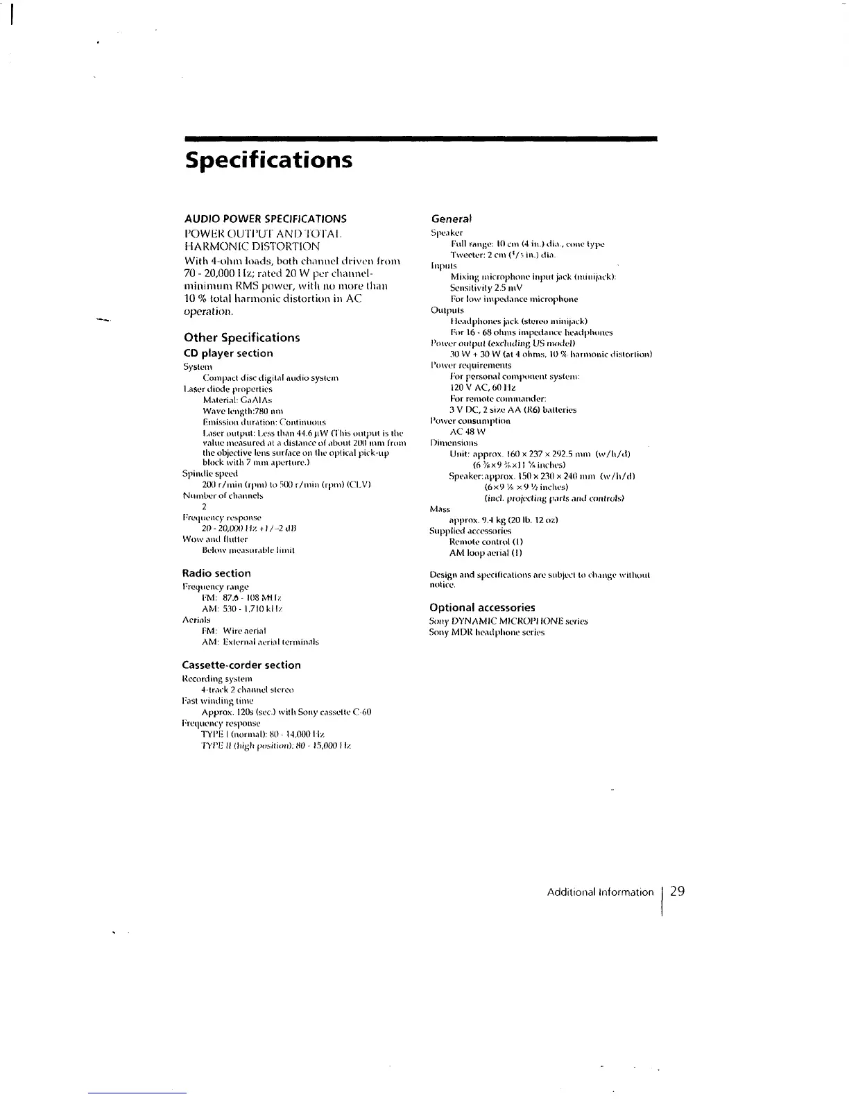 Sony PMC-202 - Specifications