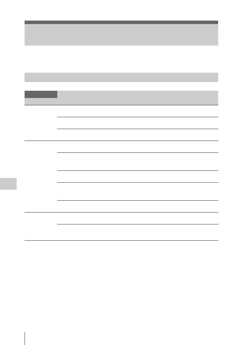 The functions and available settings of menus are listed below.
