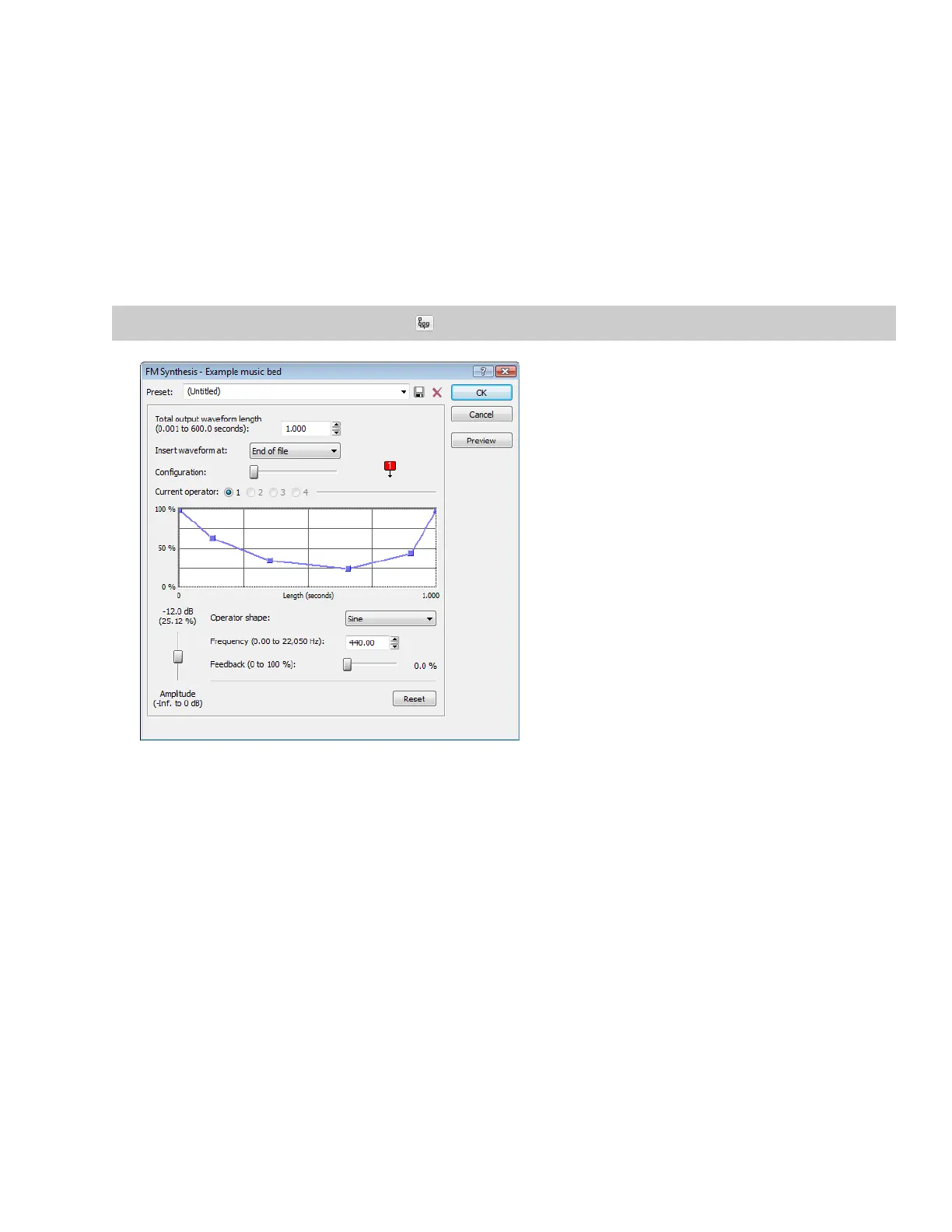 From the Insert menu, choose Synthesis, and choose FM from the submenu. The FM Synthesis dialog appears.