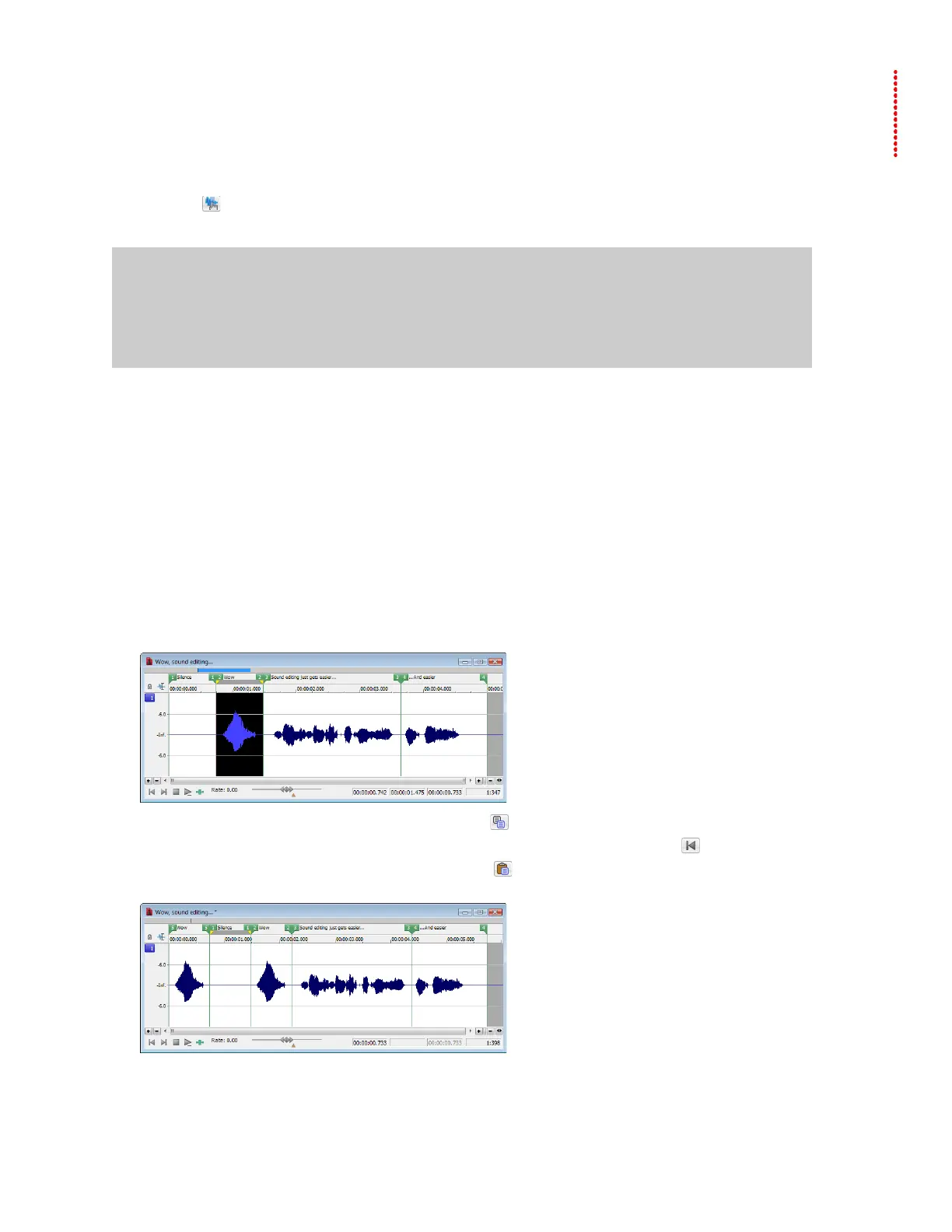 • Cutting, coping, and pasting selections and events. For more information, see Editing audio on page 71 and Editing events on page