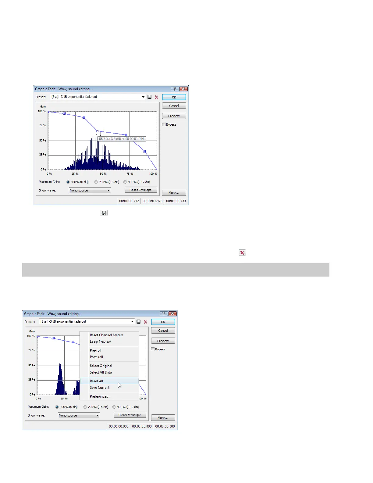 From the Preset drop-down list, choose the -3 dB exponential fade out preset. The dialog’s controls change to reflect the preset.