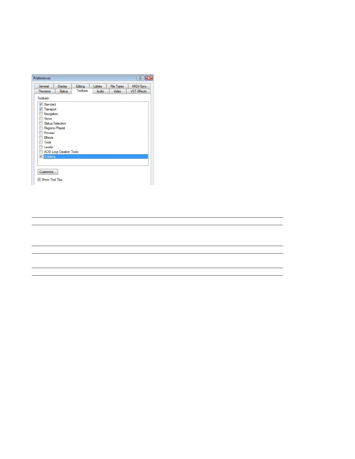 From the View menu, choose Toolbars. The Preferences dialog appears with a list of available toolbars.