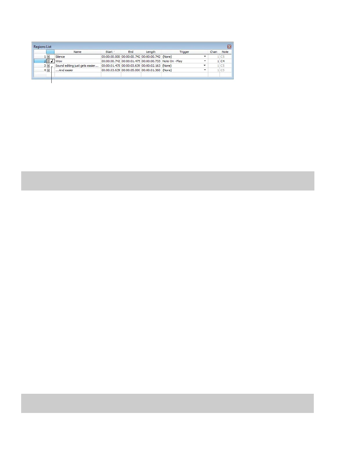 Type 1 in the Channel box and C4 in the Note box. A small musical note appears adjacent to the “Wow” region in the Regions List