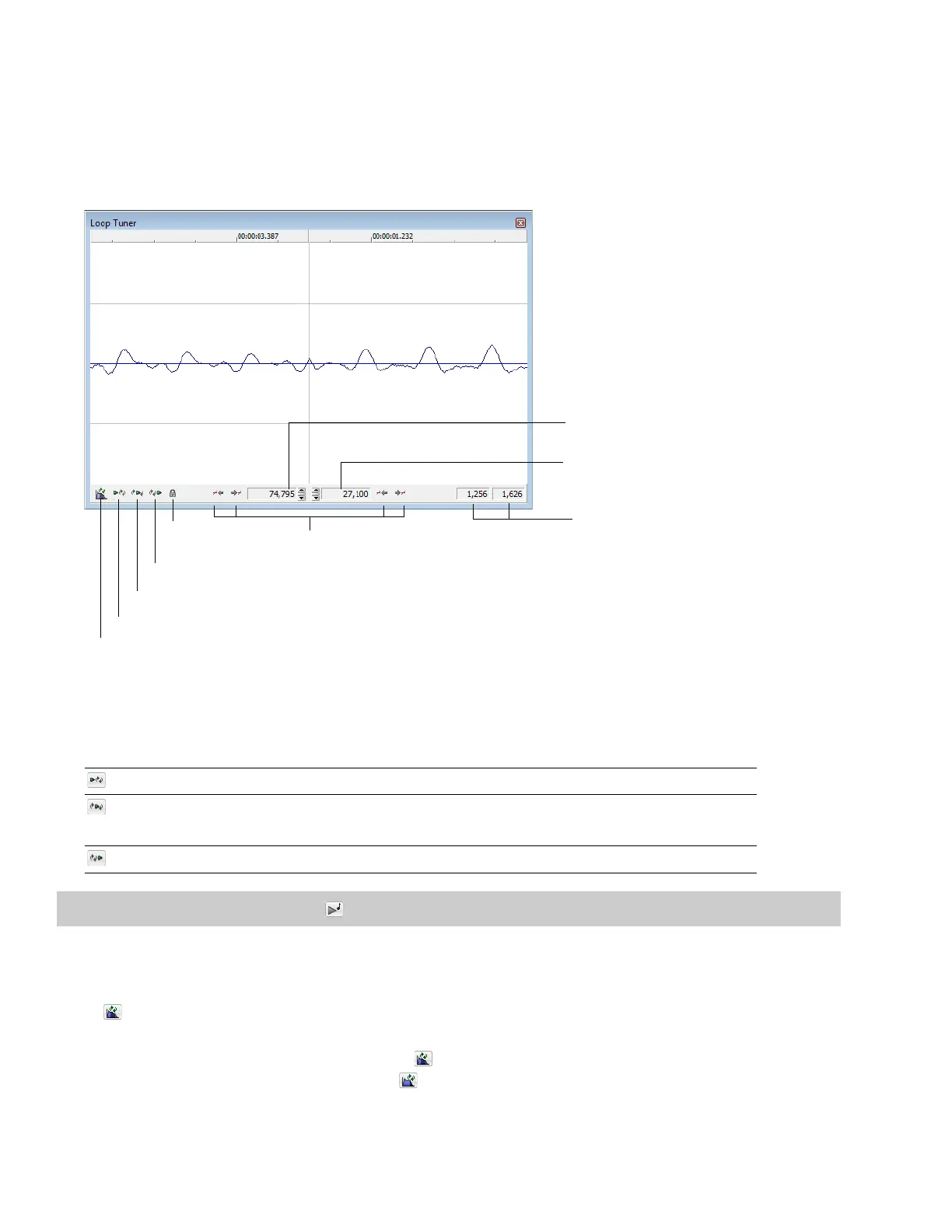 From the View menu, choose Loop Tuner. The Loop Tuner appears and displays the waveform of the file’s loop.