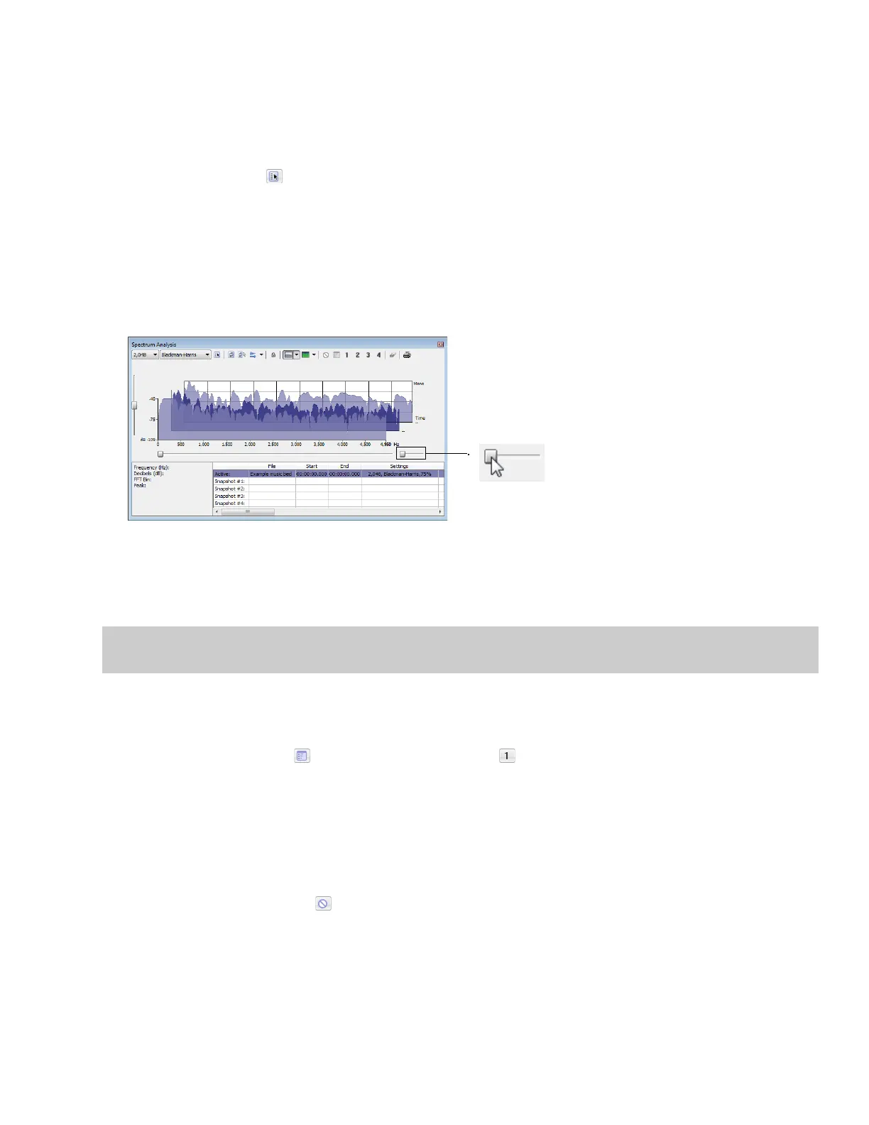 Snapshots are not available in sonogram display or when the Slices displayed setting in the Spectrum Settings dialog is greater