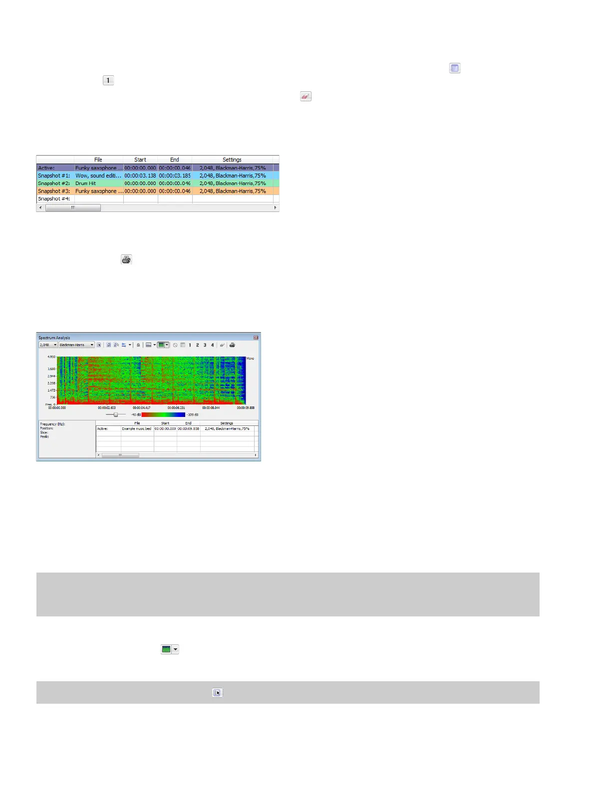 Information about each snapshot is displayed at the bottom of the Spectrum Analysis window: