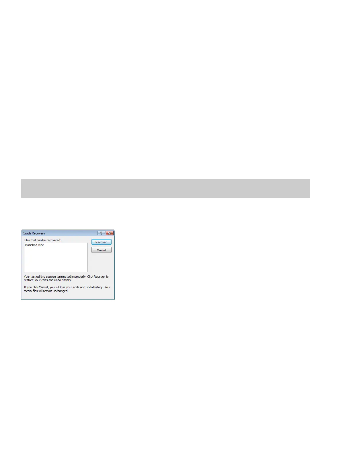 If Sound Forge software terminates improperly, you can recover all open and unsaved audio files not opened in read-only mode. When