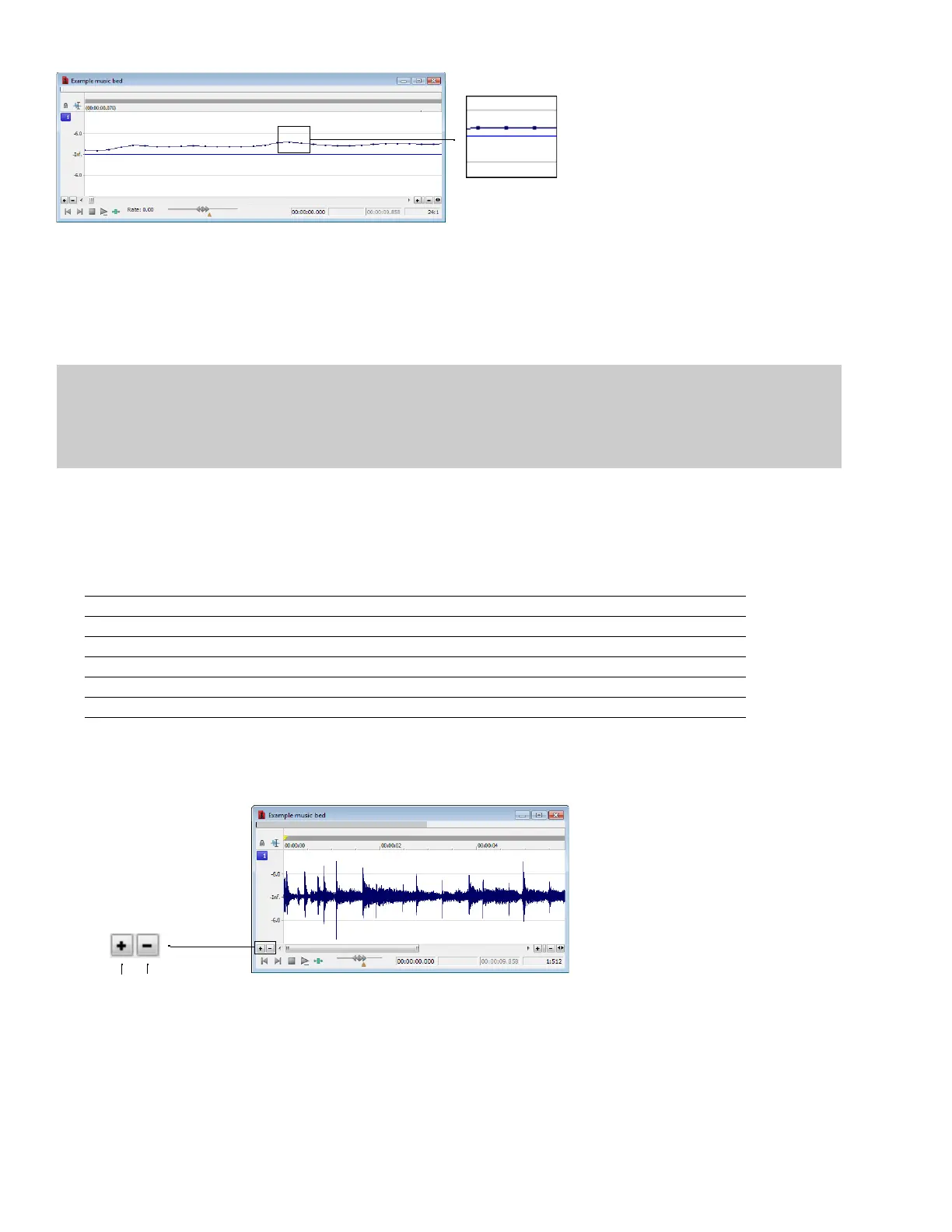 Zooming along the level ruler displays a larger vertical waveform and allows for more precise editing at low audio amplitudes.