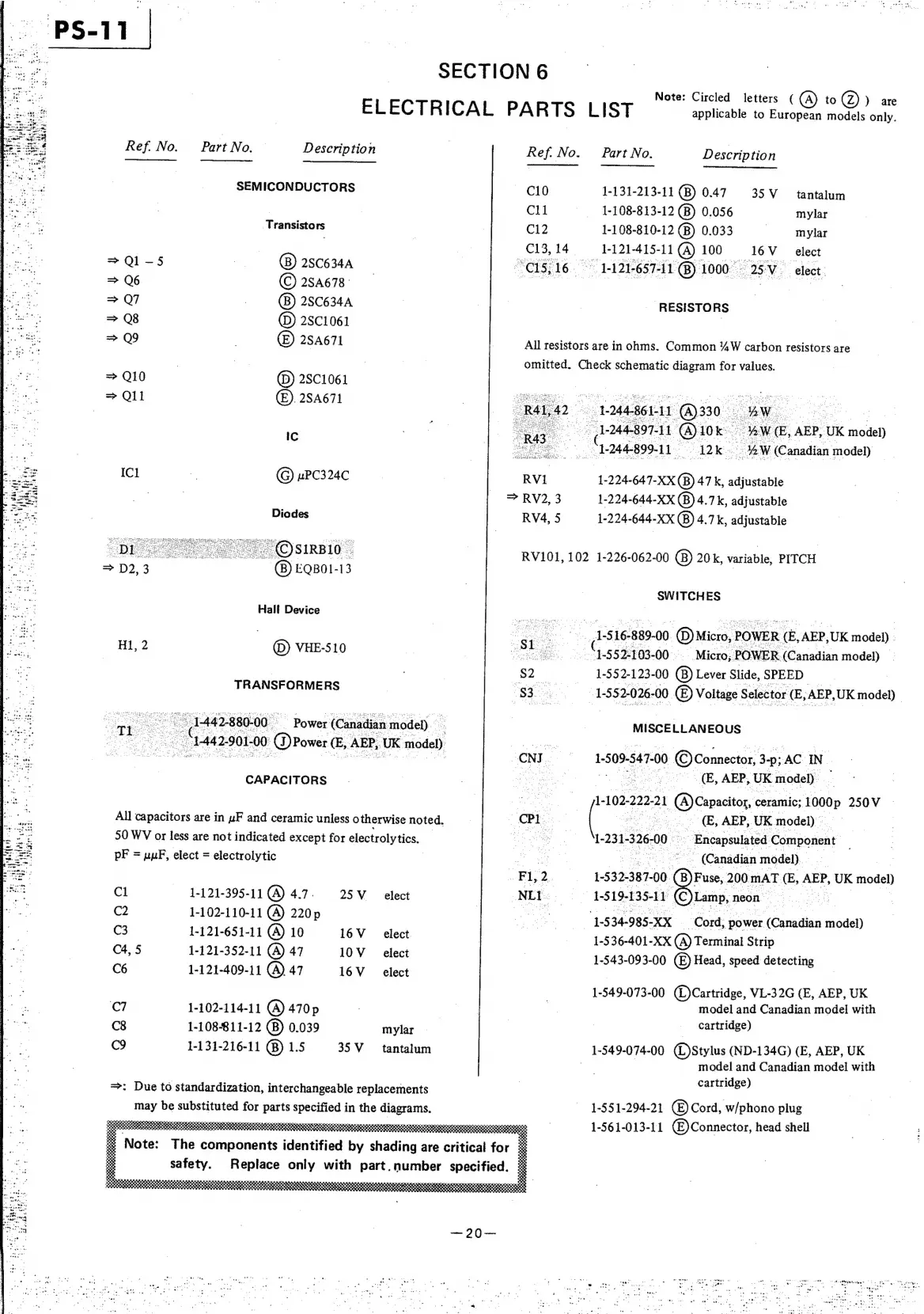 Sony PS-11 - Section 6: Electrical Parts List; Semiconductor Components; Passive Components List; Miscellaneous Electrical Parts