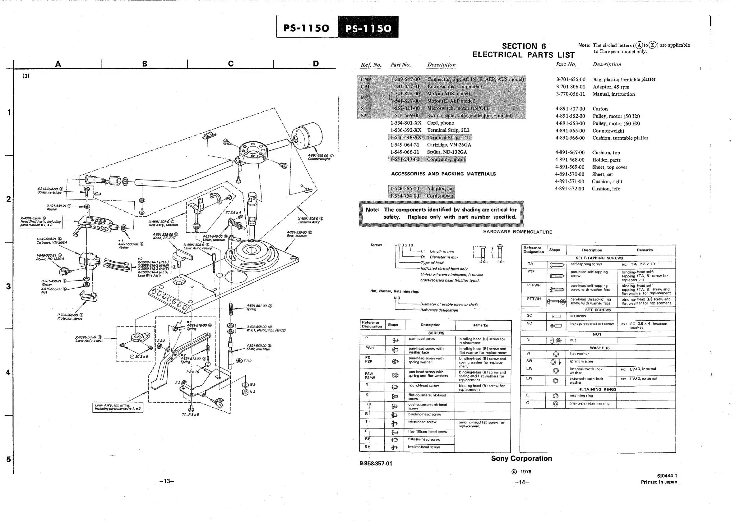 Sony PS-1150 - Section 6 Electrical Parts List; Electrical Components Listing; Accessories and Packing Materials; Hardware Nomenclature and Screws
