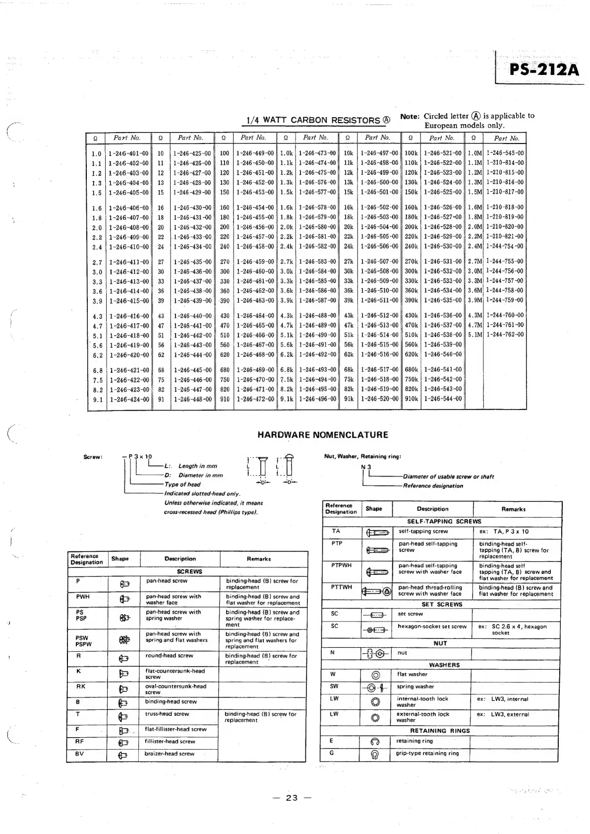 Sony PS-212A - Hardware Nomenclature; Screws, Nuts, Washers, and Retaining Rings