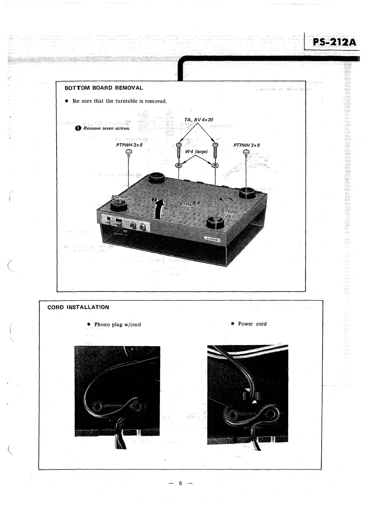 Sony PS-212A - Section 2 Disassembly (continued); Bottom Board and Cord Installation