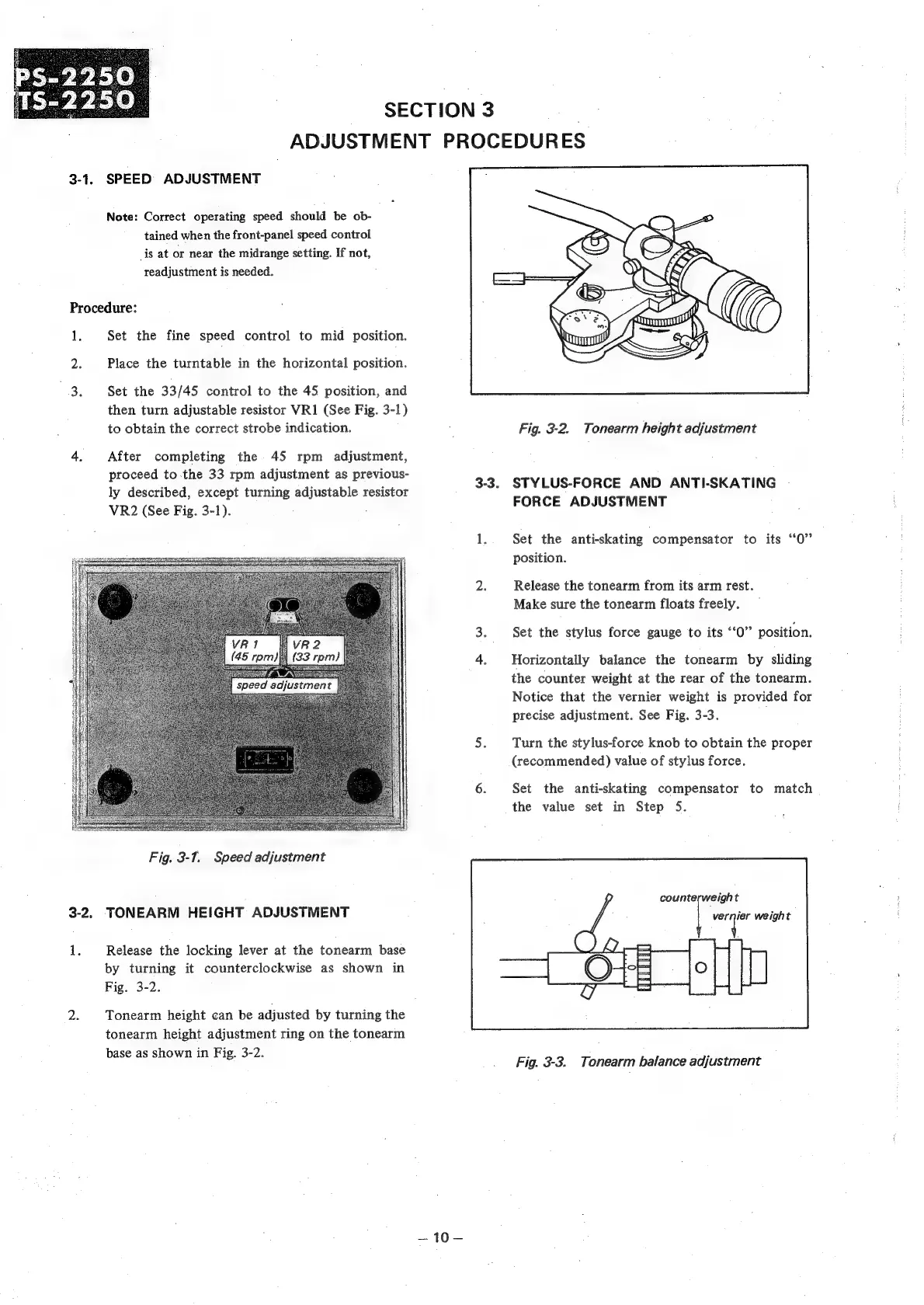 Sony PS-2250 - Adjustment Procedures; Speed Adjustment; Tonearm Height Adjustment; Stylus Force & Anti-Skating Adjustment