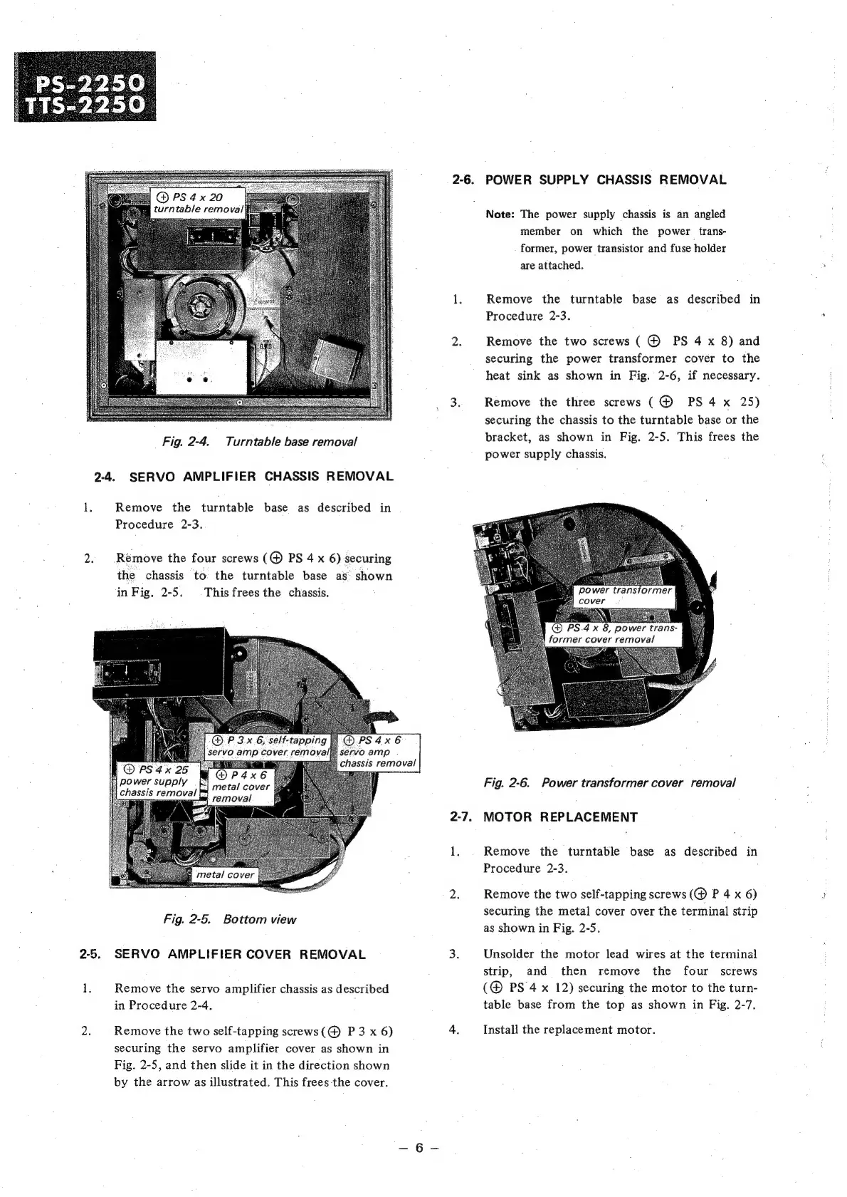 Sony PS-2250 - Servo Amplifier Chassis Removal; Servo Amplifier Cover Removal; Power Supply Chassis Removal; Motor Replacement Guide