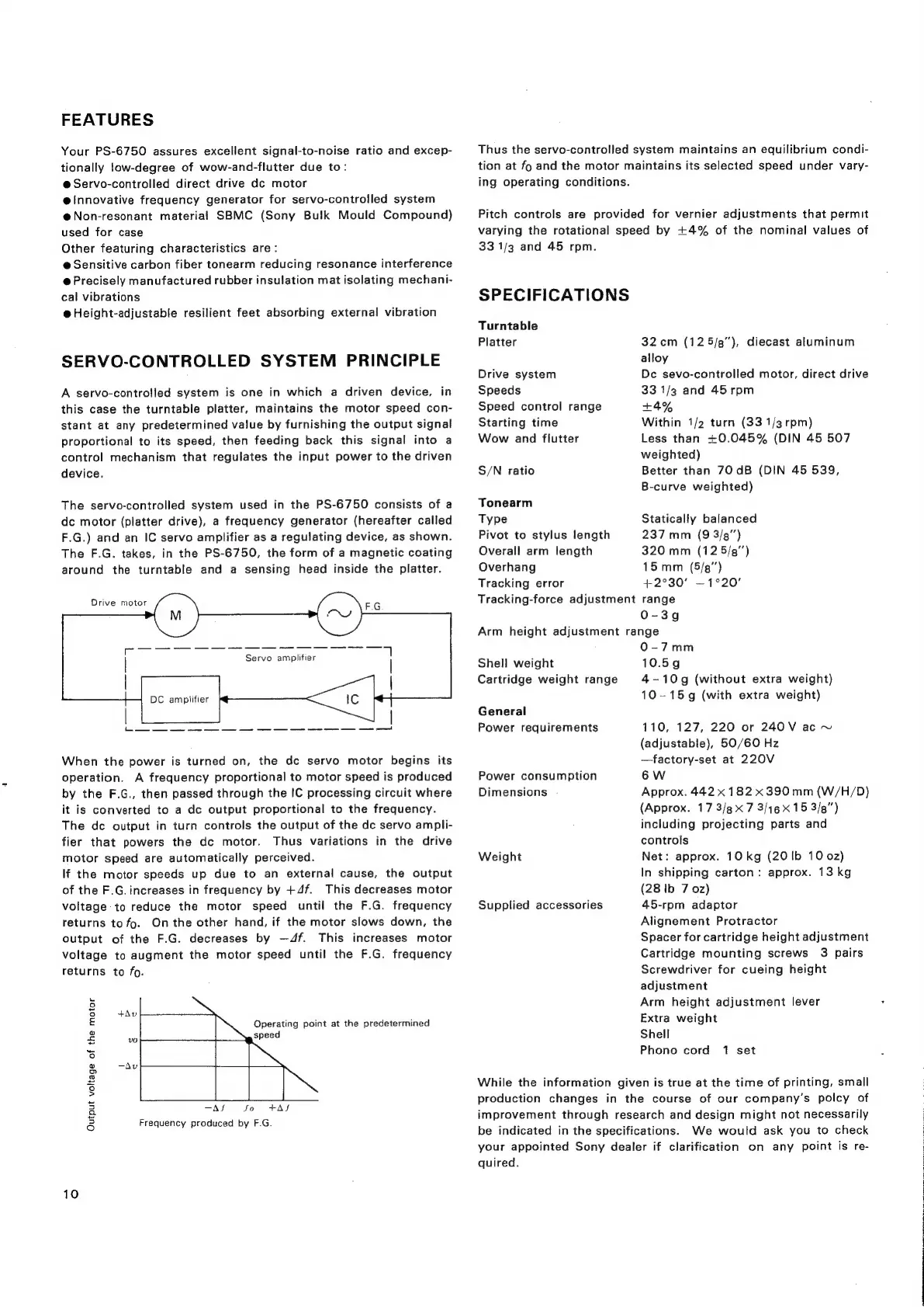 Sony PS-6750 - Product Features; Servo-Controlled System Principle; Technical Specifications
