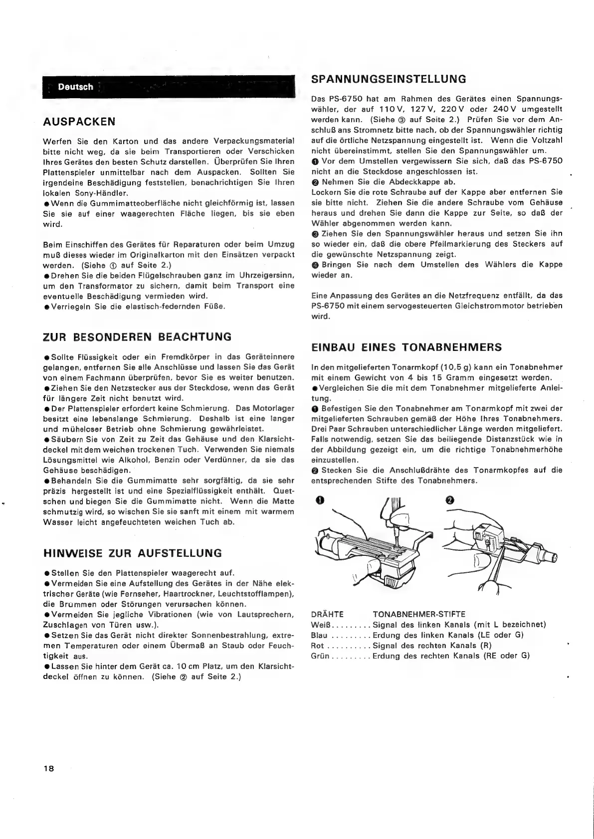 Sony PS-6750 - Auspacken; Zur Besonderen Beachtung; Hinweise zur Aufstellung; Spannungseinstellung
