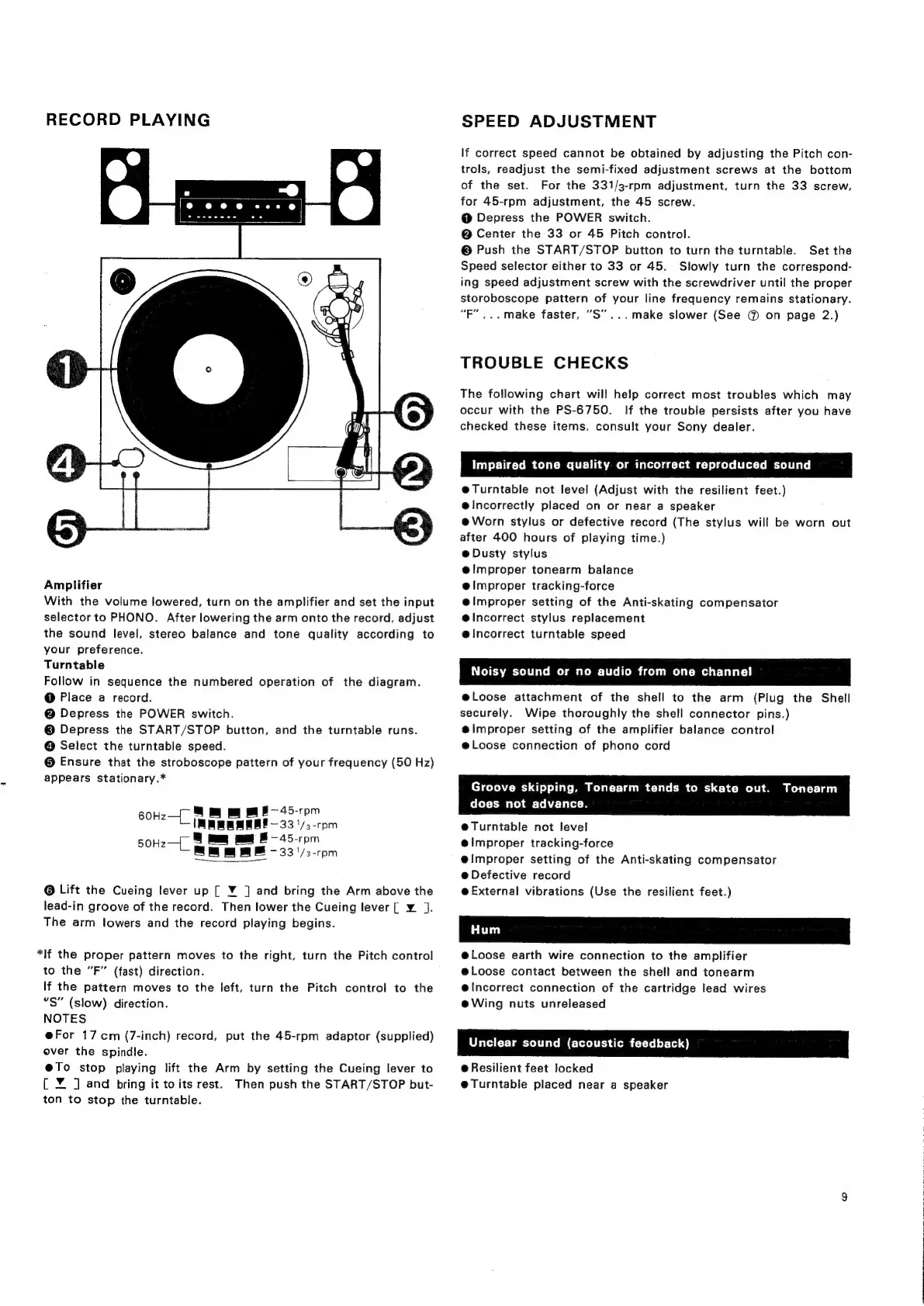 Sony PS-6750 - Record Playing Operations; Speed Adjustment Guide; Troubleshooting Common Issues