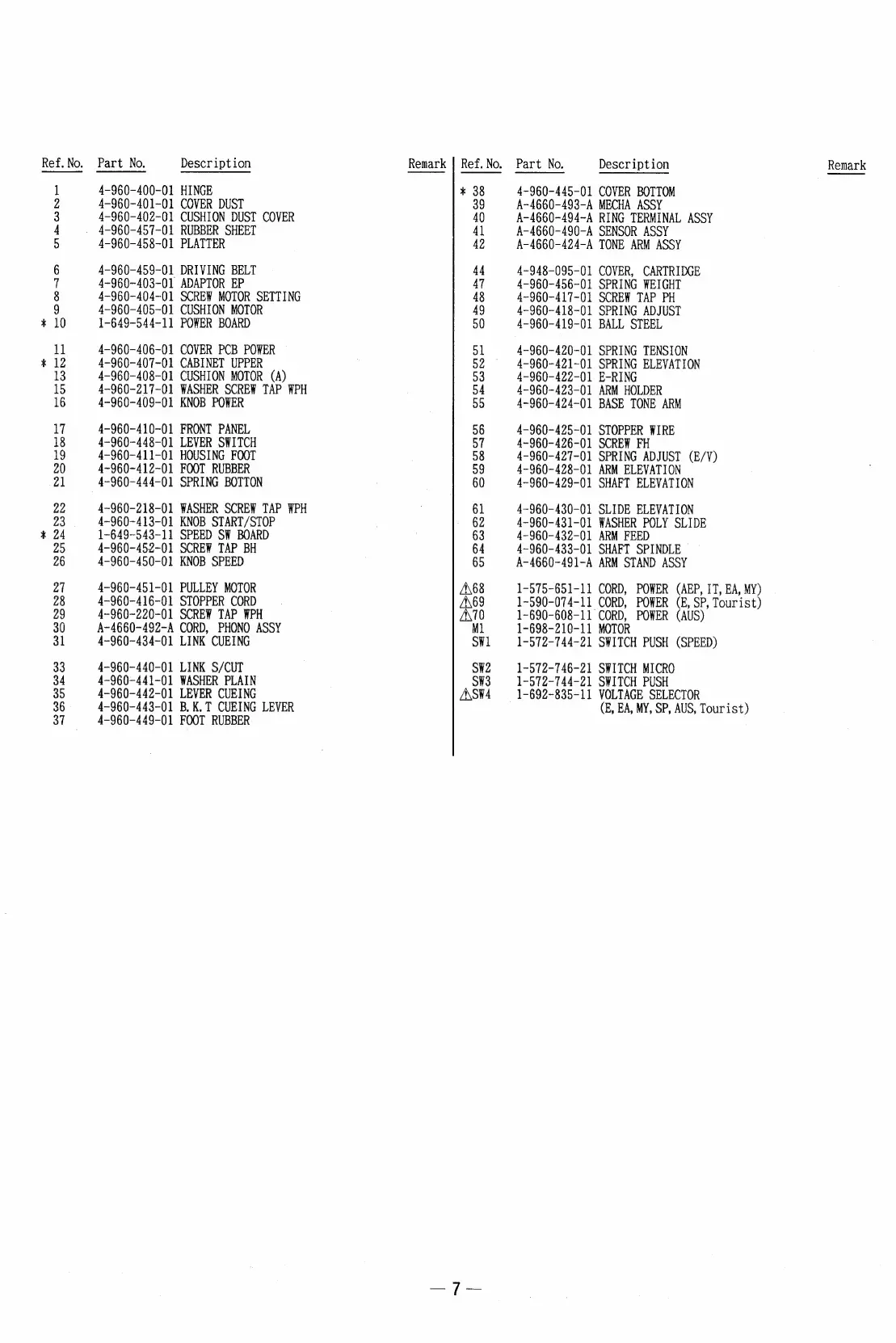 Sony PS-D707H - Parts List and Details; Main Parts Listing