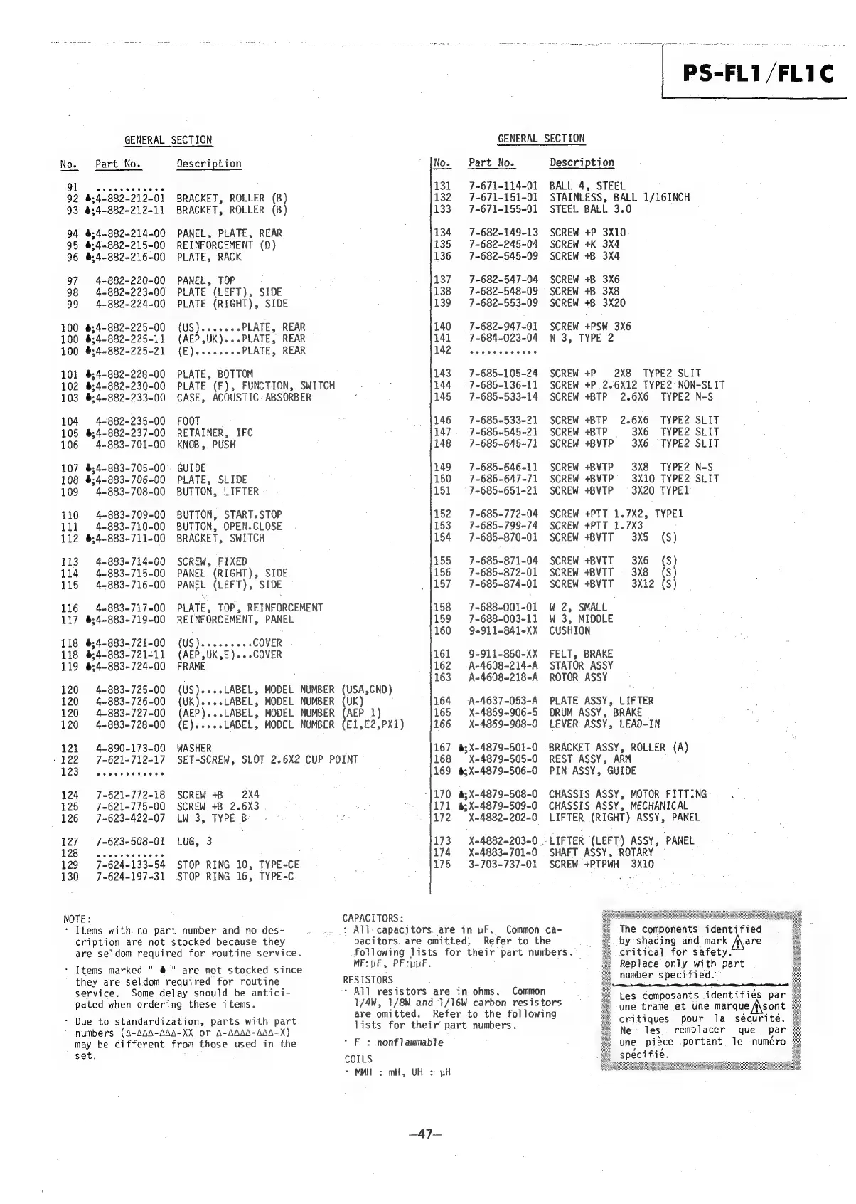 Sony PS-FL1 - General Component Parts List; Additional General Parts