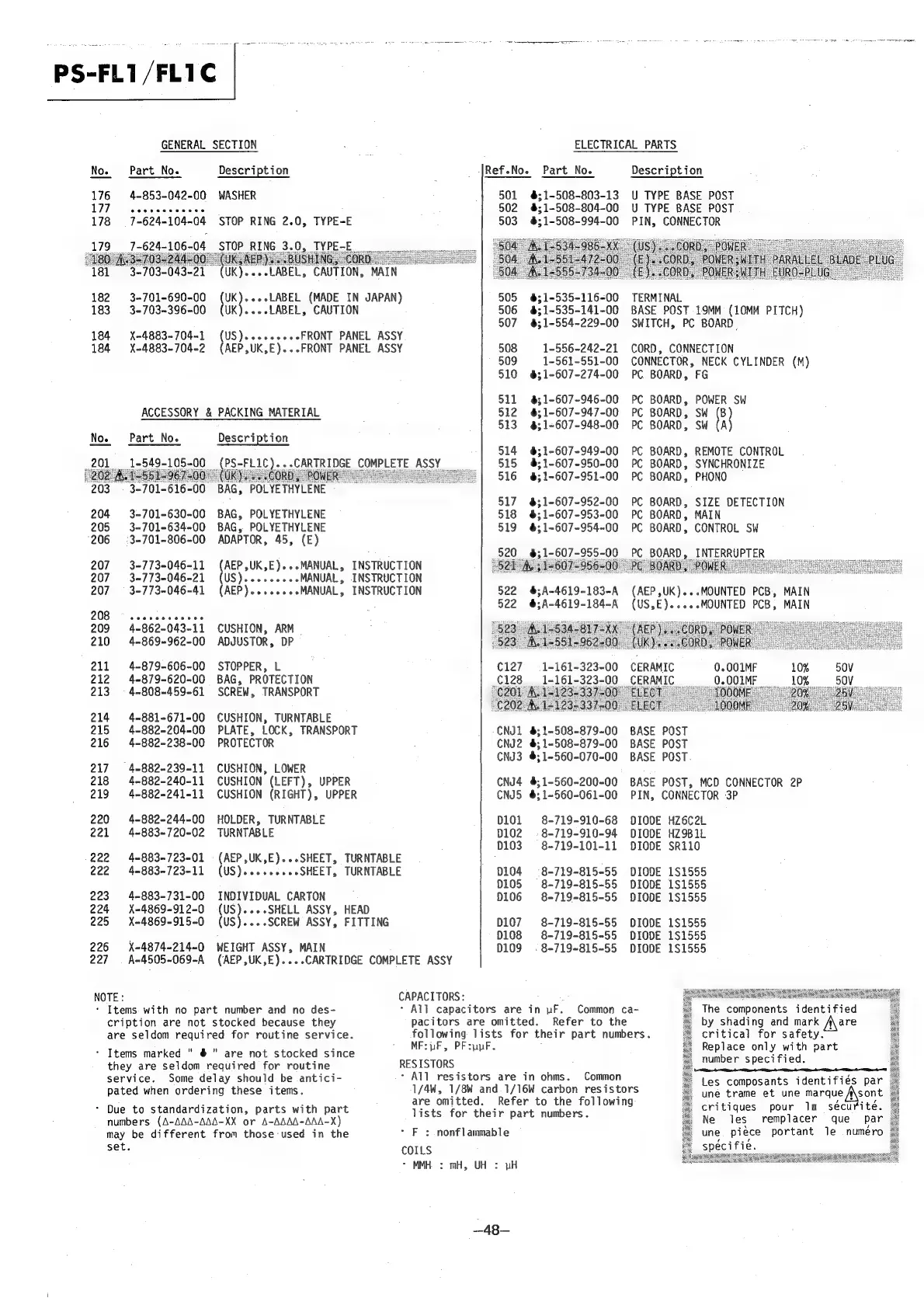 Sony PS-FL1 - Electrical Parts List; Electrical Components