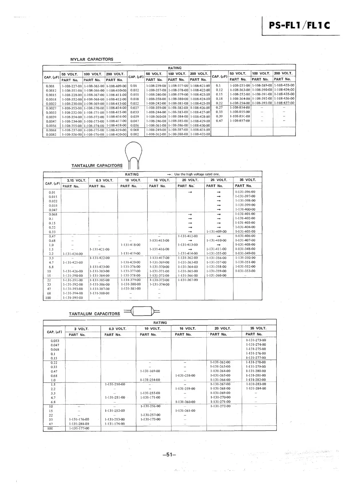 Sony PS-FL1 - Capacitor Part Numbers; Mylar Capacitor Specifications; Tantalum Capacitor Specifications