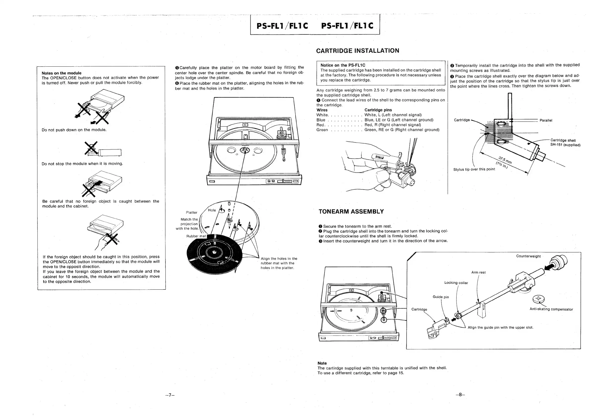 Sony PS-FL1 - Cartridge Installation; PS-FL1 C Factory Cartridge Notice; Cartridge Weight and Wiring Guidelines; Tonearm Assembly