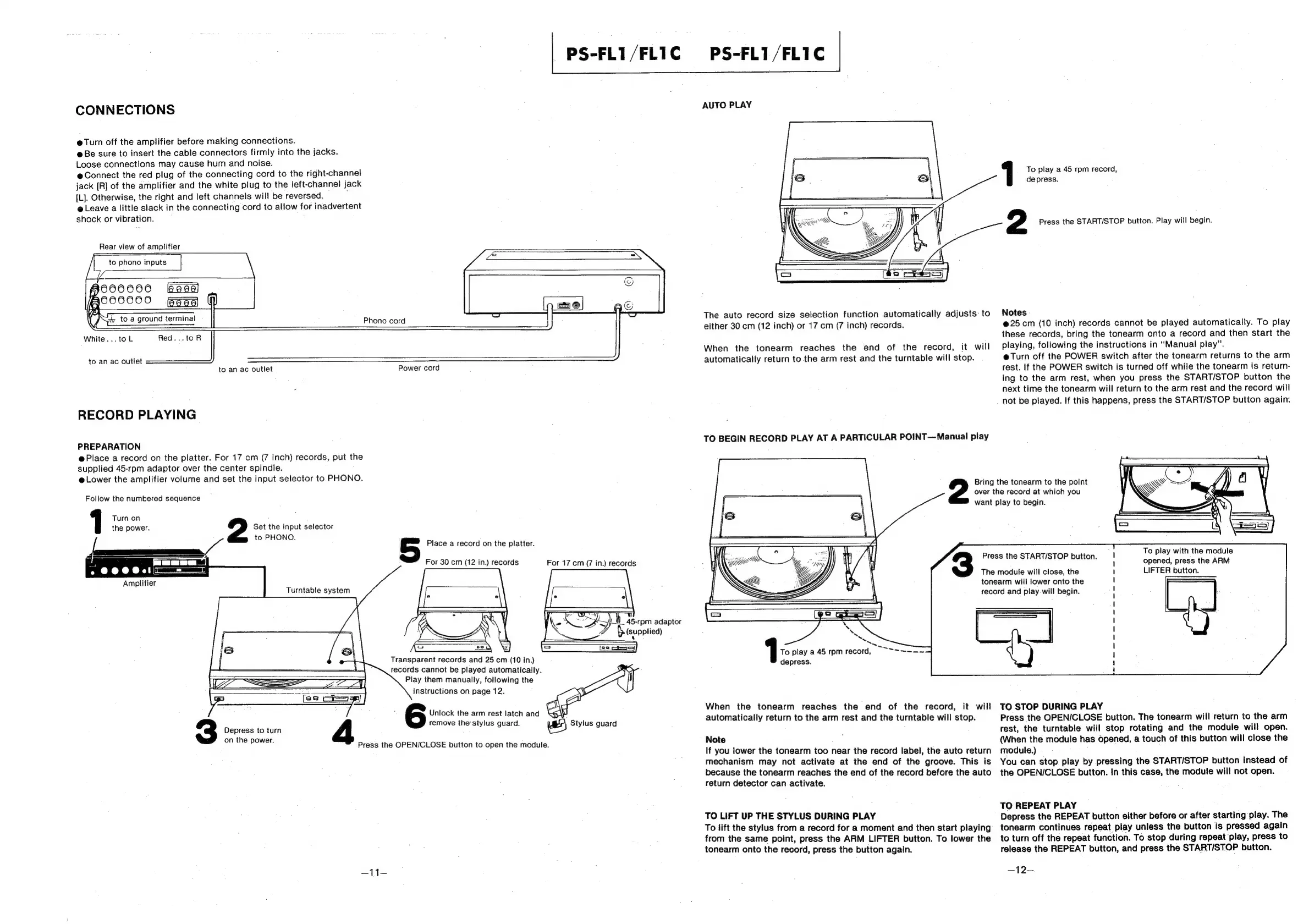 Sony PS-FL1 - Connections and Cable Management; Preparation for Connections; Connecting Audio and Ground Wires; Record Playing Operations